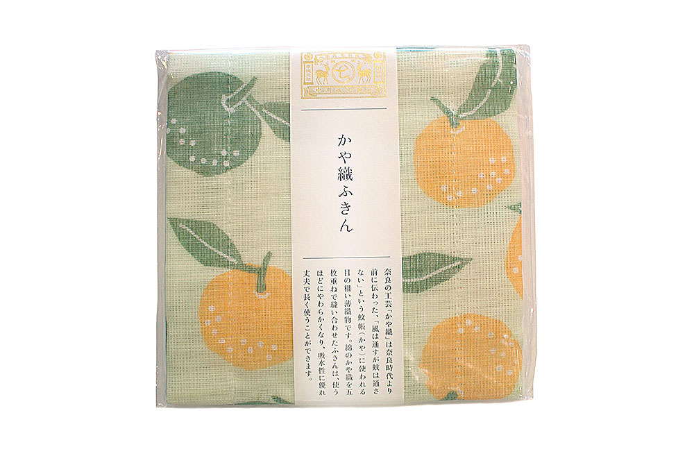 さわやかな酸味と香りで、さまざまな料理にアクセントをつけてくれる柚子。その若くて青い実と、熟して黄色くなった実をかや織ふきんに描きました。
