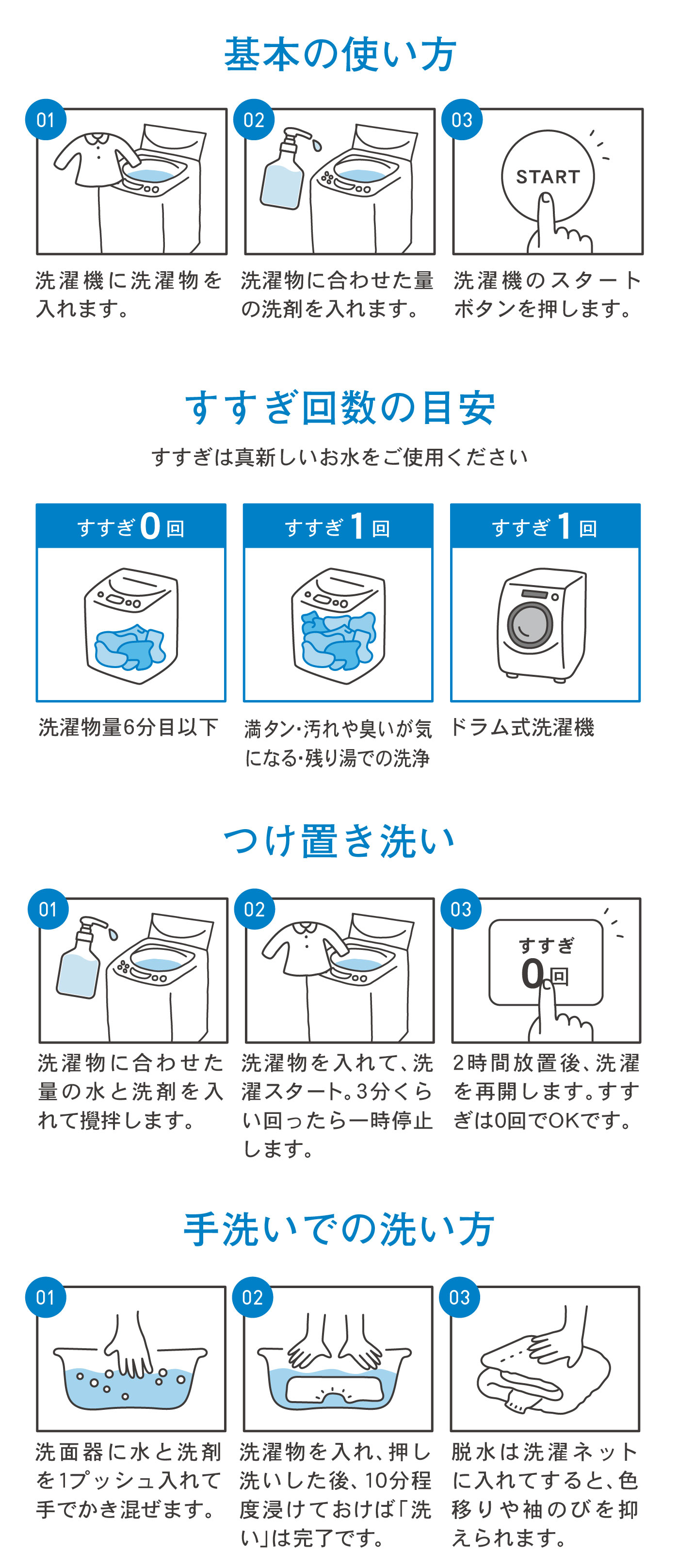 ●「すすぎ」は0回が基本です。水道代も節約できて、洗濯全体のコストがかなり下がり、お得です。